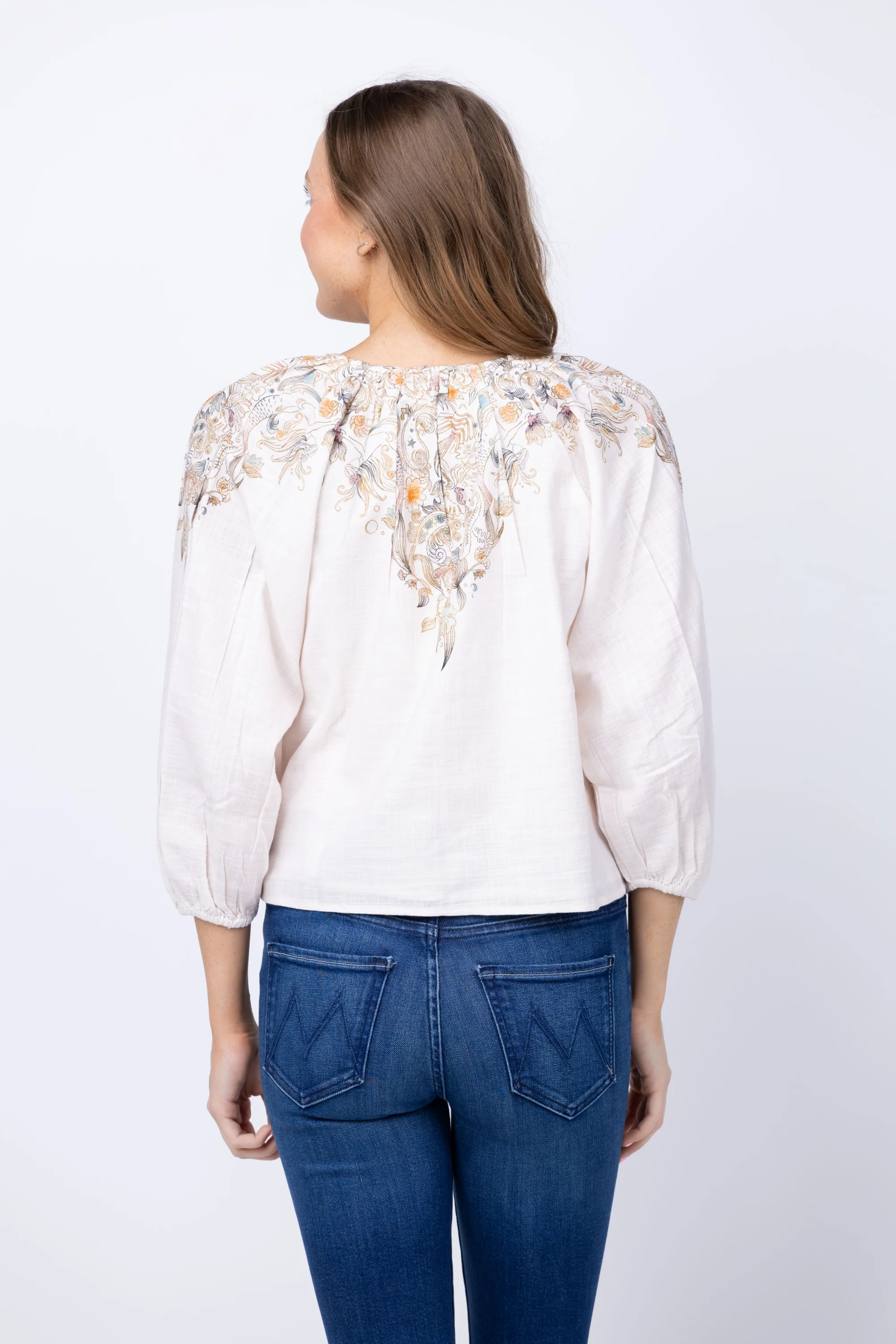 Meet the Issey Top—a masterpiece of conscious craftsmanship made from 100% GOTS-certified organic cotton and ethically handmade in India. Flowing long sleeves and a charming tie-front neckline adorned with delicate logo beads create an effortlessly feminine silhouette that exudes relaxed elegance. The thoughtfully placed Bella Mer print adds visual interest without overwhelming the design, making this versatile piece perfect for warm-weather styling.