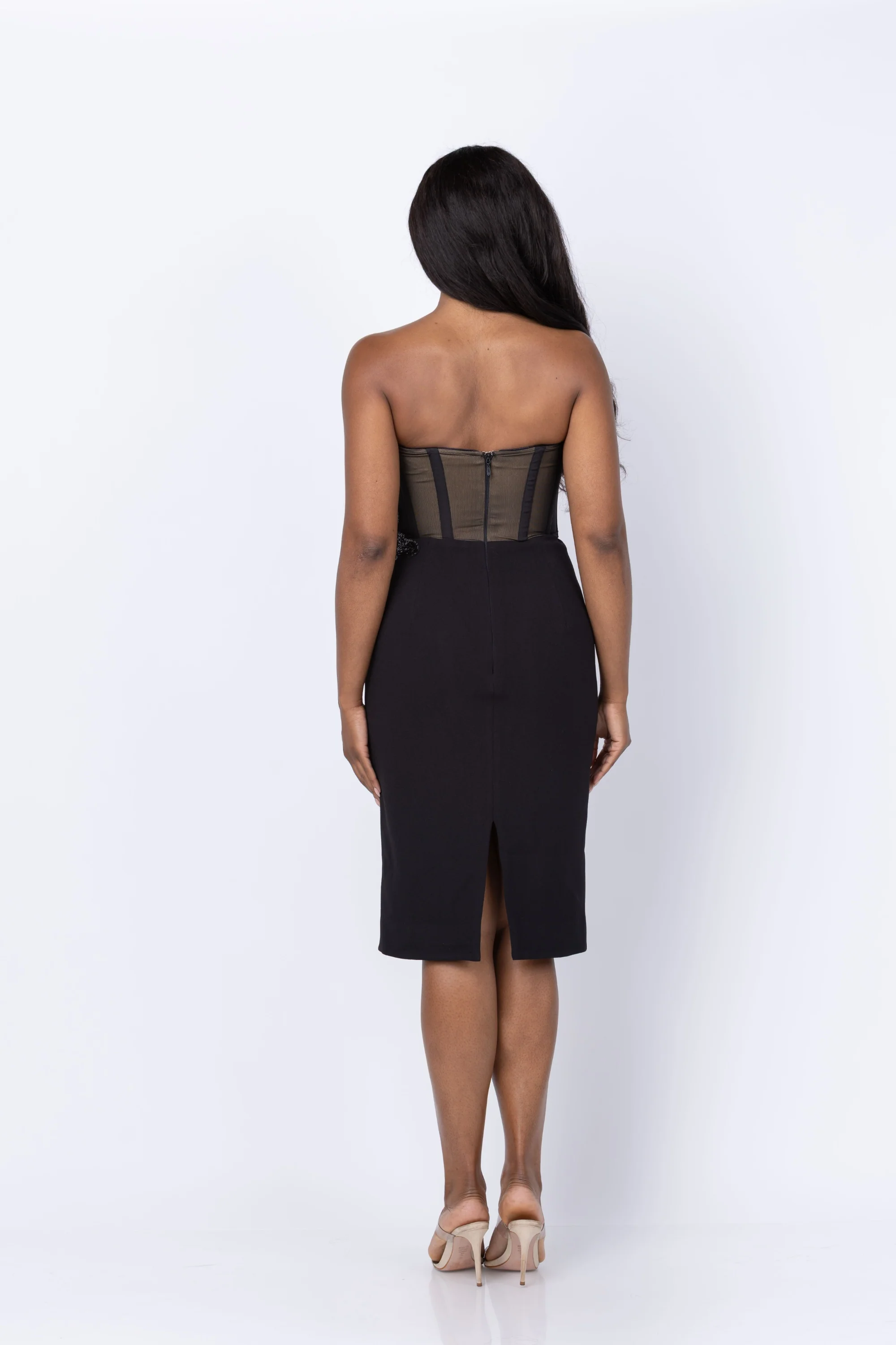 This stunning black midi dress features an eye-catching 3D floral sequin applique that commands attention. The structured bustier bodice with built-in bra cups and underwire provides confident support, while covered boning at the front and back ensures a flattering, body-con silhouette. Fully lined for comfort and finished with a sleek back seam zipper, this dress transitions effortlessly from evening events to special occasions. The intricate beadwork and architectural design make it an unforgettable statement piece.