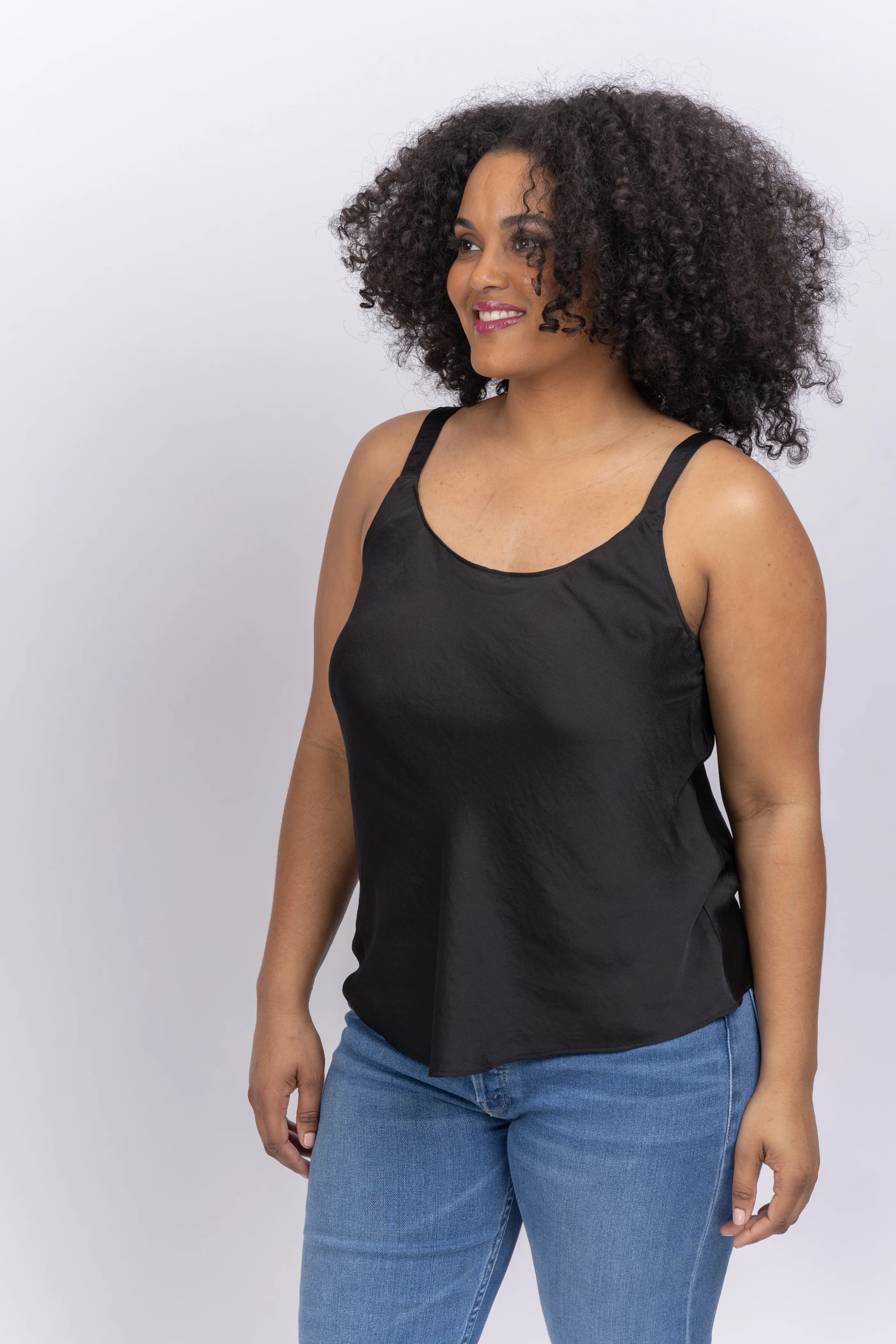 A scoop neck tank with a little bit of sheen, this versatile top is a must-have layer for your dressier looks--but with its lightweight comfort and satiny feel if you want to use it as a pajama top, we won't tell. With solidly constructed straps that complement the style and a hem that falls at the waist.