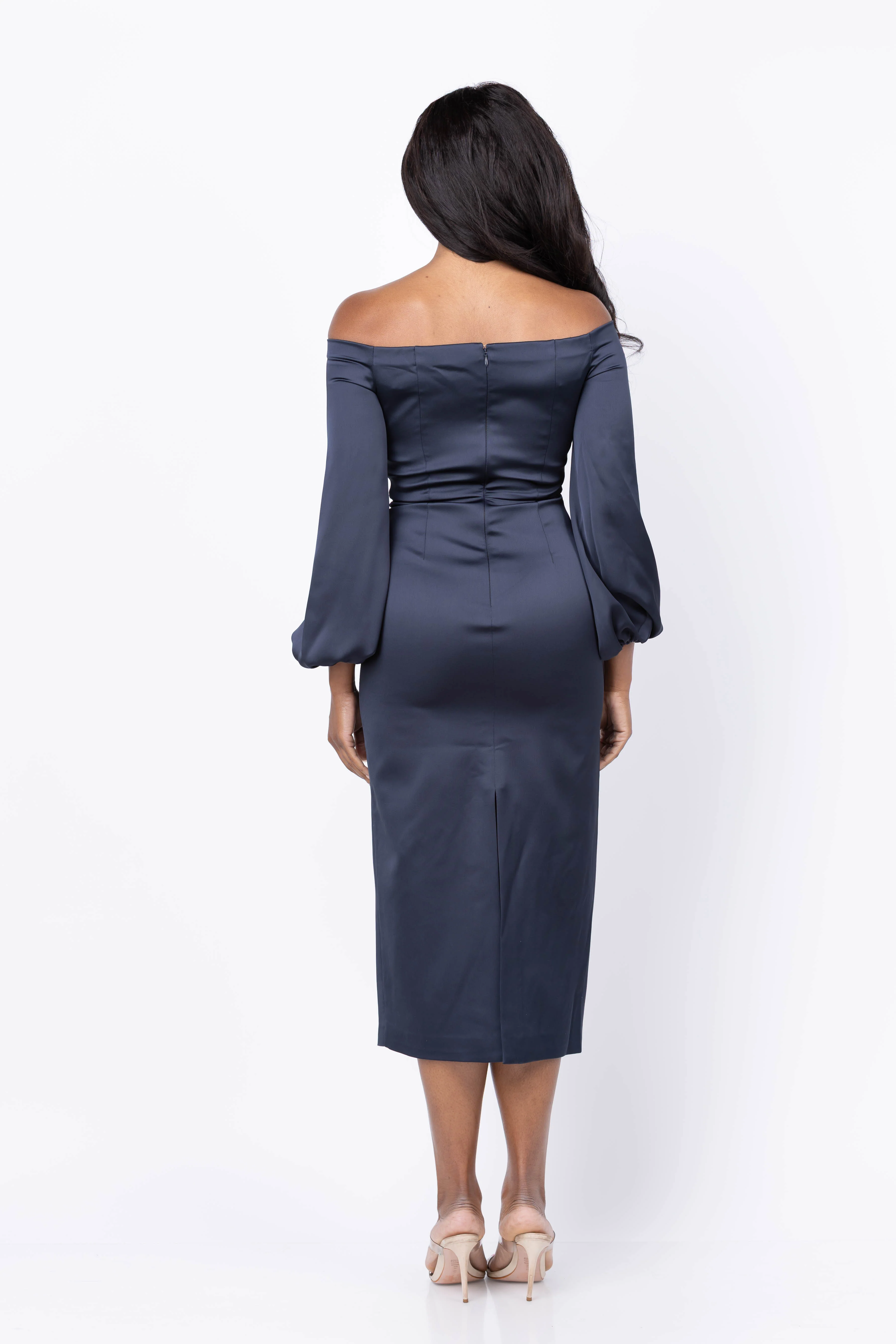 Sweep them off their feet in the Shiyan, an off-the-shoulder beauty with long sleeves and fitted bodice. The center back slit adds movement to the stretch satin silhouette. This romantic stunner is perfect for formal events, holiday parties, or any occasion that calls for timeless sophistication.