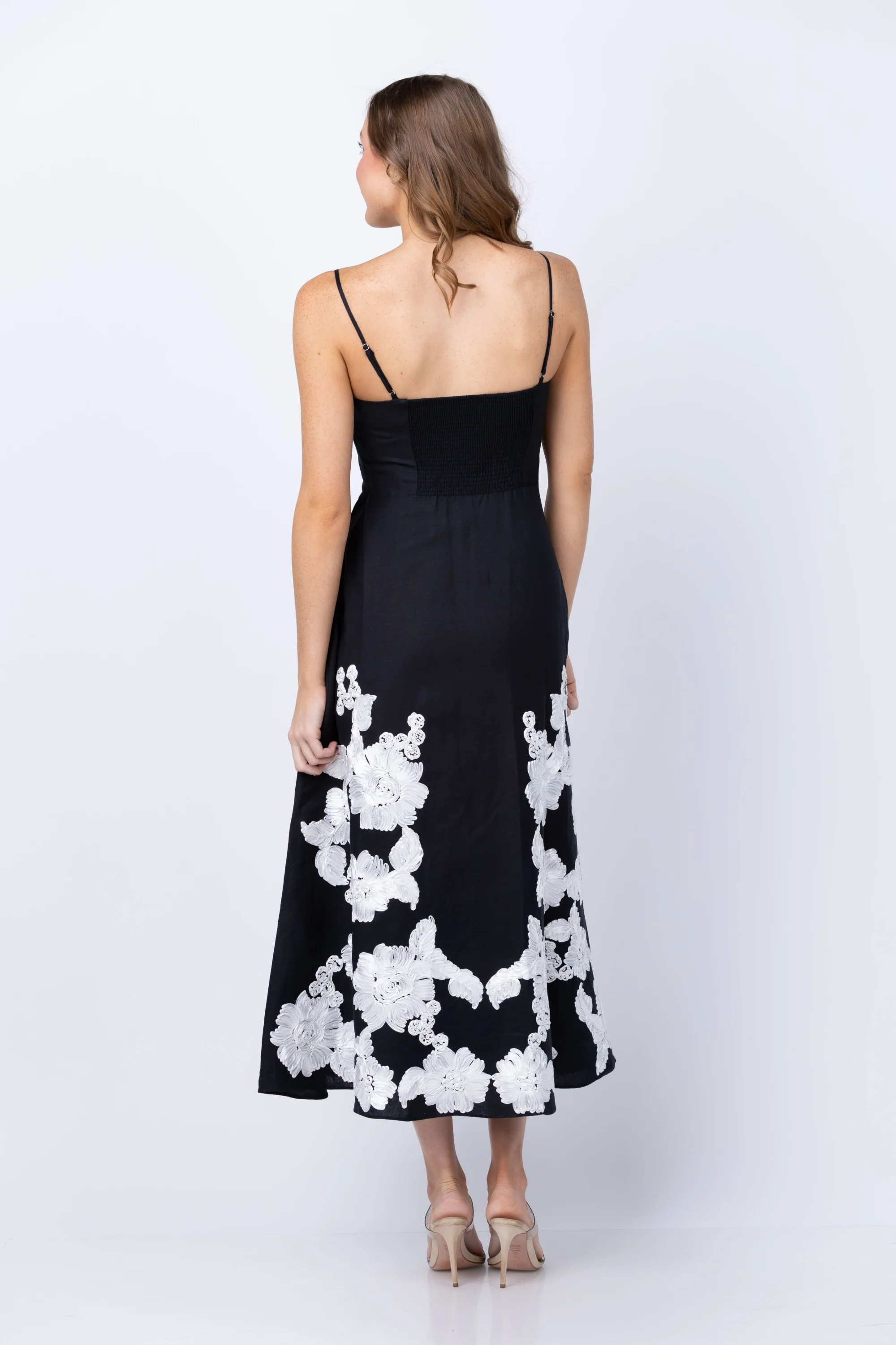 Elevate your wardrobe with the Simkhai Annabella Midi Dress, a stunning piece that combines timeless elegance with modern design. This sleeveless pullover dress features a flattering fit-and-flare silhouette that gracefully skims your curves, while the square neckline adds a sophisticated touch. The smocked back provides comfortable movement and visual interest, while delicate floral soutache detailing adorns the skirt for an artisanal finish. Fully lined for confidence and comfort, this black multi colorway transitions seamlessly from day to evening occasions.