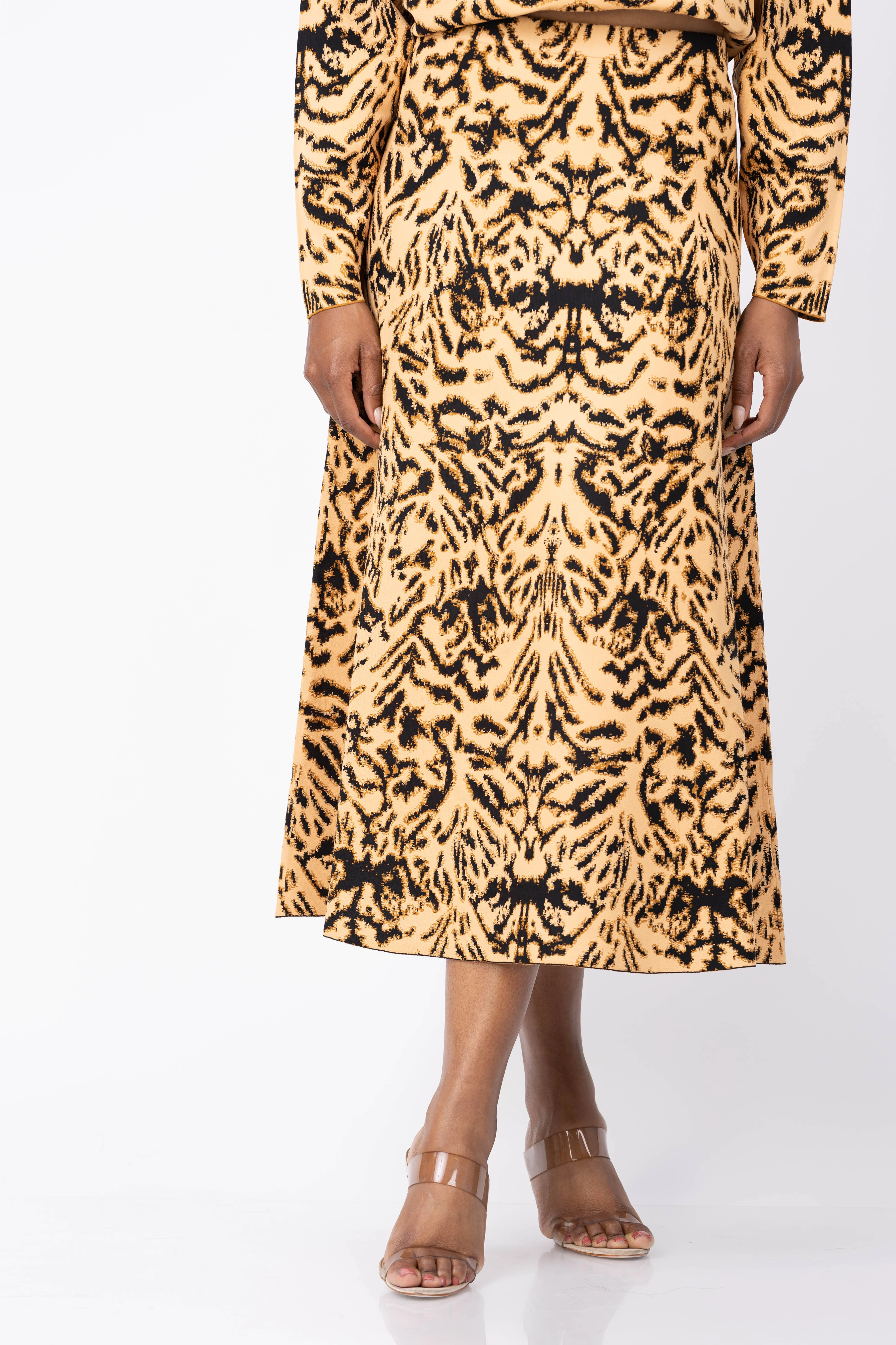 Elevate your wardrobe with the Ulla Johnson Lani Jacquard Knit Skirt in Bengal. Featuring a vibrant animal-inspired pattern in luxurious light gold and black, this skirt blends bold style with sophisticated design. The stretch jacquard knit ensures a comfortable fit, while the elastic waist offers ease of wear. Its flared, A-line silhouette creates graceful movement and timeless elegance, making it an eye-catching piece for any occasion.