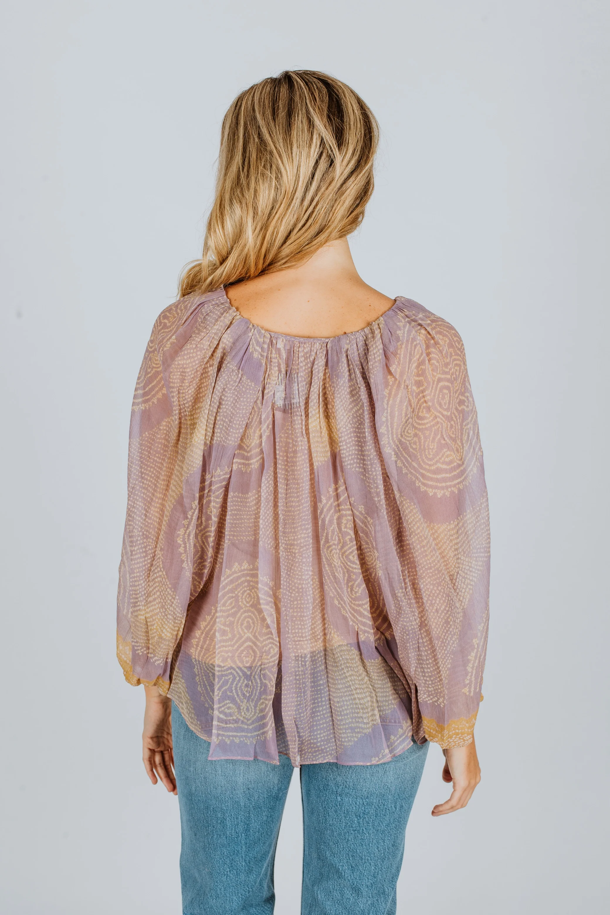 The Pauline Blouse is made from Ulla's gilded silk crinkle chiffon. It's printed with a shibori-inspired artwork which expands across the flowing silhouette. This peasant blouse has draped sleeves, an open neck and contrast ties at the neckline. Ashley is wearing a size 4.