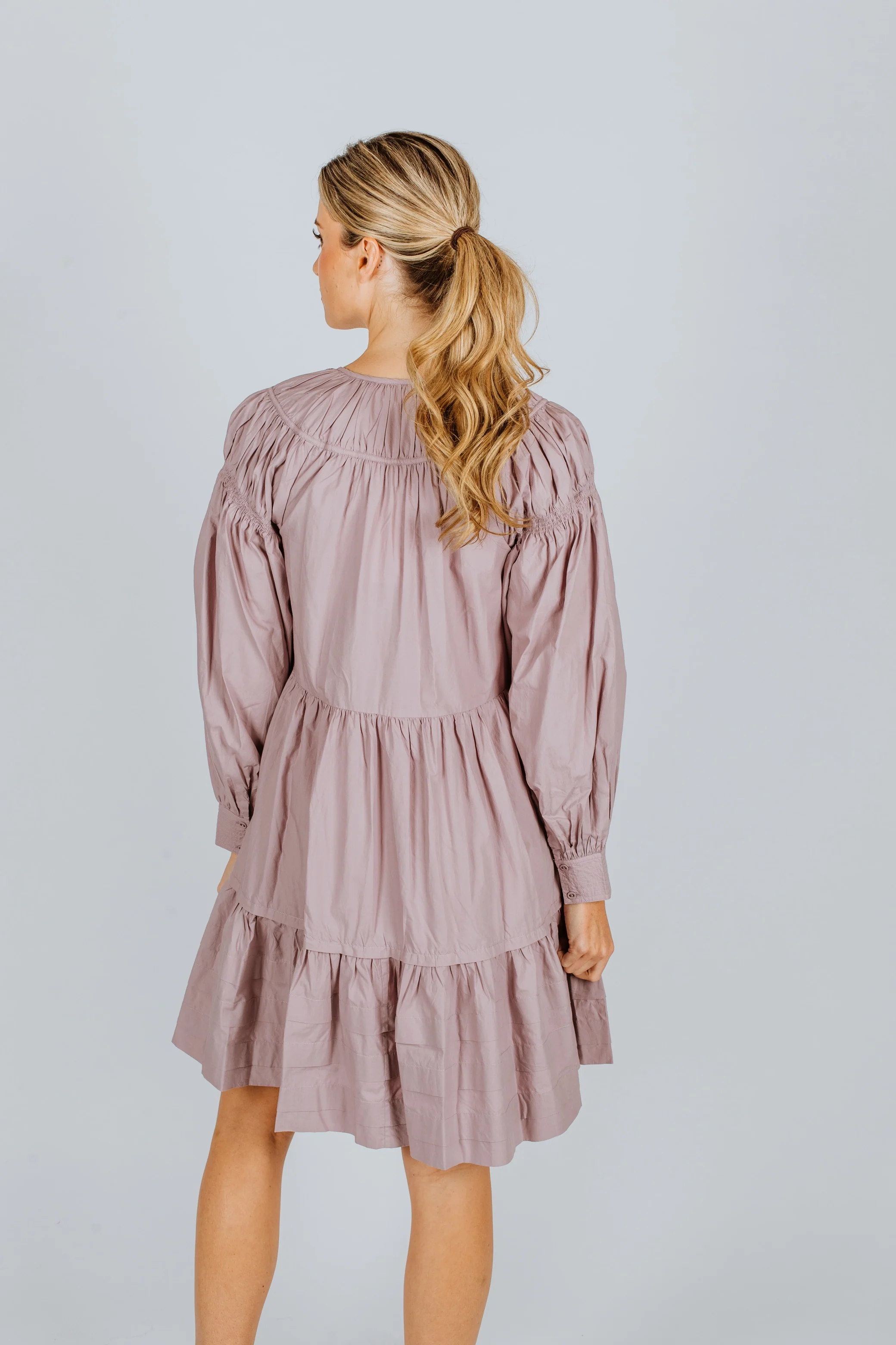The Rosa Dress is a knee-length swing dress made from our soft, water washed cotton poplin. It has a smocked neckline, tiered bodice, and blouson sleeves finished with a buttoned cuff. Pair this mini with a knee-high boot or chunky heel. Ashley is wearing a size 6.