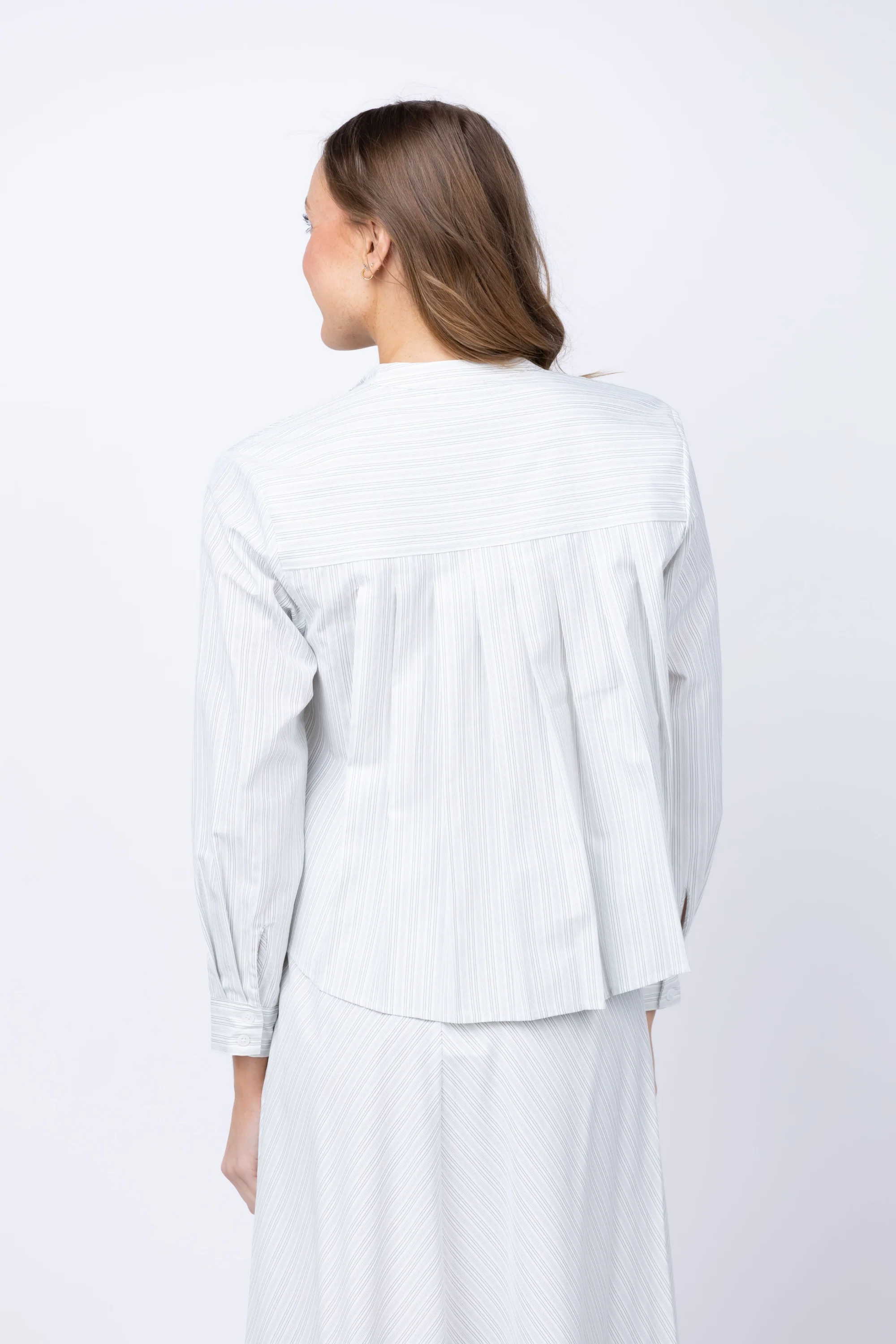 The Sadie Shirt is a masterclass in understated sophistication. Its architectural design features clean lines and a structured mini stand collar that commands attention without demanding it. Strategic pleating at the back provides subtle volume and movement, while the cropped length hits just past your natural waist—the ideal pairing with high-waisted skirts and trousers. Long sleeves finished with pleated cuffs deliver tailored polish from wrist to collar. Modern yet timeless, this shirt effortlessly elevates any wardrobe with its refined simplicity and impeccable construction.